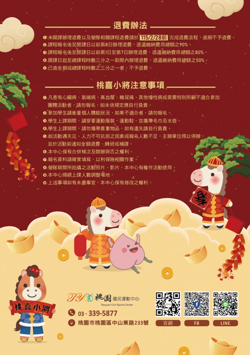 1.未開課辦理退費以及營隊相關課程退費請於115/2/28前完成退費流程,逾期不予退費。 2.課程報名後至開課日以前第8日辦理退費,退還繳納費用總額之90%。 3.課程報名後至開課日以前第1日至第7日辦理退費,退還繳納費用總額之80%。 4.開課日起至總課程時數三分之一前間內辦理退費,退還繳納費用總額之50%。 5.已逾全期或總課程時數之三分之一者,不予退費。 |